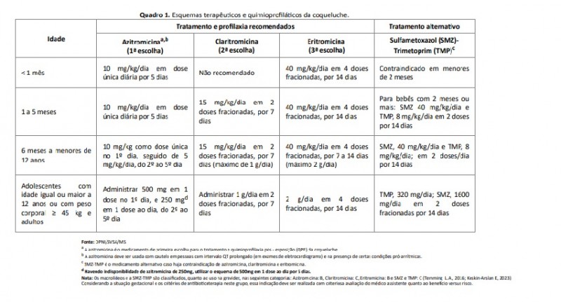 A azitromicina deve ser administrada uma vez ao dia durante 05 dias e a claritromicina, de 12 em 12 horas durante 07 dias. Os novos esquemas terapêuticos facilitam a adesão dos pacientes ao tratamento e, especialmente, à quimioprofilaxia dos contatos próximos. A azitromicina pode ser usada no tratamento das crianças com menos de 01 mês de idade. Nos casos de contraindicação ao uso da azitromicina e da claritromicina, recomenda-se o sulfametoxazol + trimetropin. A eritromicina ainda poderá ser usada, porém é contraindicada para menores de 01 mês de idade e nas situações em que ocorra intolerância ou dificuldade de adesão.